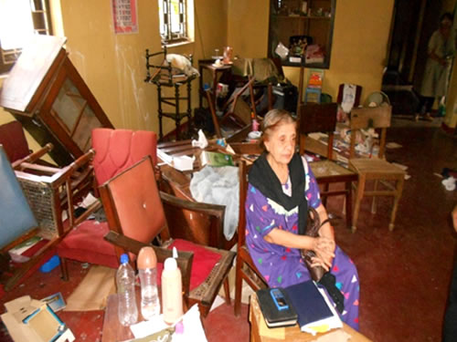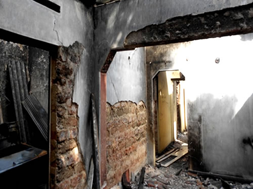 › Mrs MTM Rouzan is a mother of eight children – 3 boys and 5 girls. Her husband is a teacher. Father died one month ago, mother in iddah. She and her immediate family live in 14 houses – adjoining each other. During curfew time, groups of people had entered and removed all belongings including cash and jewellery (and gold sovereigns) and after removal had thrown petrol bombs and houses burnt.Above – houses belonging to Mrs Rouzan's familyAll these incidents had taken place while the men were trapped with the curfew and the women had fled to safety. Above – houses belonging to Mrs Rouzan's family