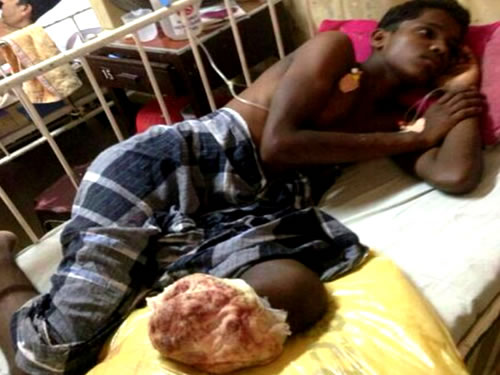 › 18 year old Amjath went with the others when they heard that the mosque was to be attacked. There he received a gunshot injury on his leg. It took nearly one and a half hours before he was taken to the Nagoda Hospital. No immediate treatment had been given. The wound had festered, blackened and smelling. Finally he was taken to Colombo where his leg has been amputated. A crying mother, Mrs Rajab has still not seen the son who is lying in the Colombo Hospital.Amjath is an assistant in a trishaw repairing shop.
